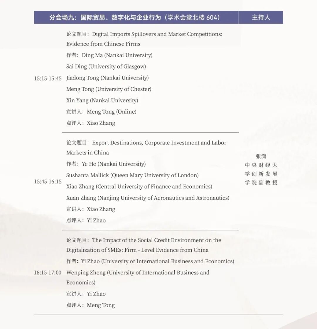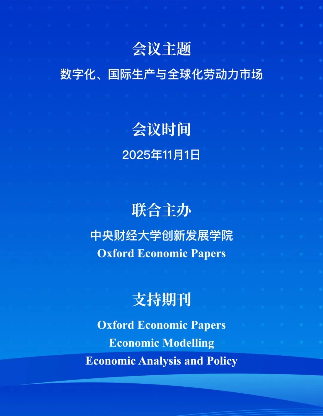 为深入学习贯彻党的二十届四中全会精神,进一步提升全要素生产率,发展新质生产力,凝聚学术界智慧和力量,助力实现经济高质量发展,中央财经大学创新发展学院将于2025年11月1日隆重举办“2025中财-牛津经济论文(Oxford Economic Papers)特刊会议”。本次会议邀请了国内外知名专家学者,围绕“数字化、国际生产与全球化劳动力市场”等前沿热点议题进行深入交流与探讨。会议着重聚焦数字经济、人工智能与劳动力市场的理论创新与实践应用,旨在打造一个高水平、多元化、国际化的学术交流平台,促进国内外学者思想碰撞,推动学界与业界的深度融合。