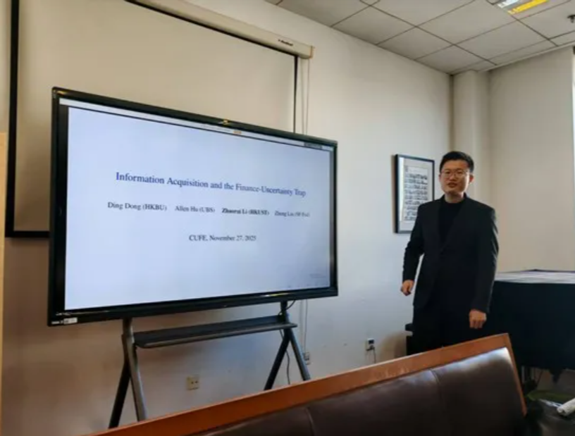 2025年11月27日中午,中央财经大学创新发展学院学术讲座在学术会堂712举行。受中国经济与管理研究院的邀请,香港科技大学李兆睿博士后举行题为“Information Acquisition and the Finance-Uncertainty Trap”(信息获取与金融-不确定性陷阱)的学术讲座。讲座由何其春教授主持。创新发展学院多位老师、博士参加了讲座。