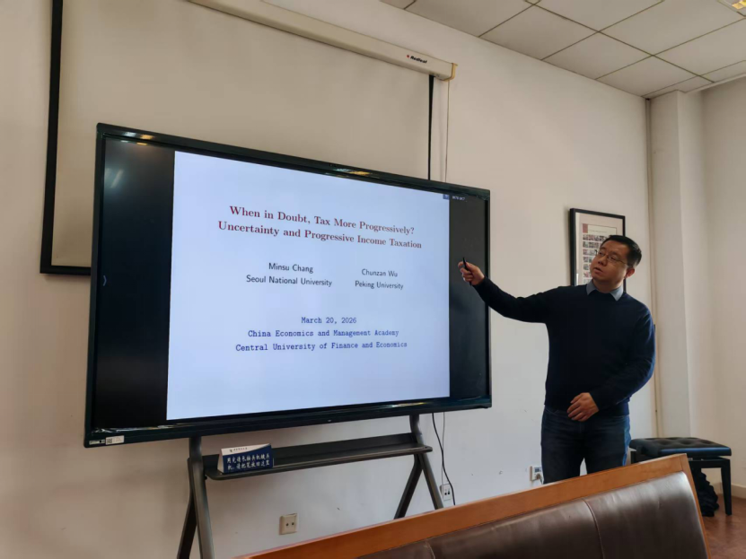 2026年3月20日中午,中央财经大学创新发展学院中国经济与管理研究院学术讲座在学术会堂712举行。受中国经济与管理研究院的邀请,北京大学新结构经济学研究院助理教授吴春赞老师举行题为When in Doubt, Tax More Progressively? Uncertainty and Progressive Income Taxation”(存疑时应提高税收累进性?—— 不确定性与累进所得税)的学术讲座。讲座由中国经济与管理研究院院长何其春教授主持。创新发展学院多位老师、博士、硕士、本科生参加了讲座。
