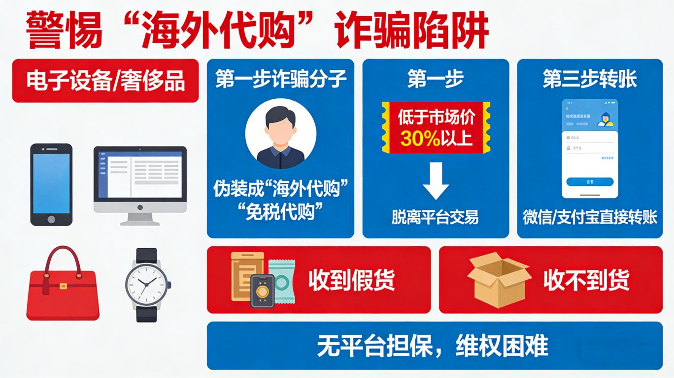 骗子伪装海外代购,以低于市场价的正品为诱饵,诱骗受害者脱离平台私下转账。受害者付款后血本无归,又因无平台担保维权极为困难。