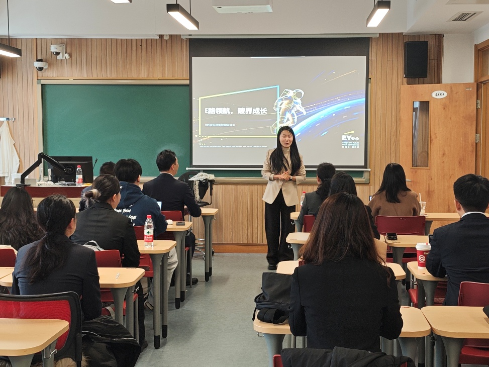 宣讲会上,安永校园招聘团队负责人胡佳欣,首先围绕“E路领航,破界成长”的校招主题,对安永的价值主张、业务布局等方面进行了详细阐述。