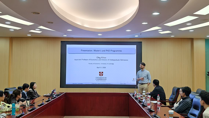 2026年4月17日,剑桥大学经济系硕博及暑期项目宣讲会在中央财经大学学院南路校区学术会堂604举行。为进一步拓宽师生国际视野,提升海外深造与国际交流能力,创新发展学院特邀剑桥大学经济系副教授、招生主任Oleg Kitov博士,以及剑桥大学南京科技创新中心对外关系主管吴泽昱女士来校宣讲,为全校师生带来剑桥大学经济系硕博项目及暑期学术项目的权威资讯。活动由创新发展学院副院长赵阳主持。