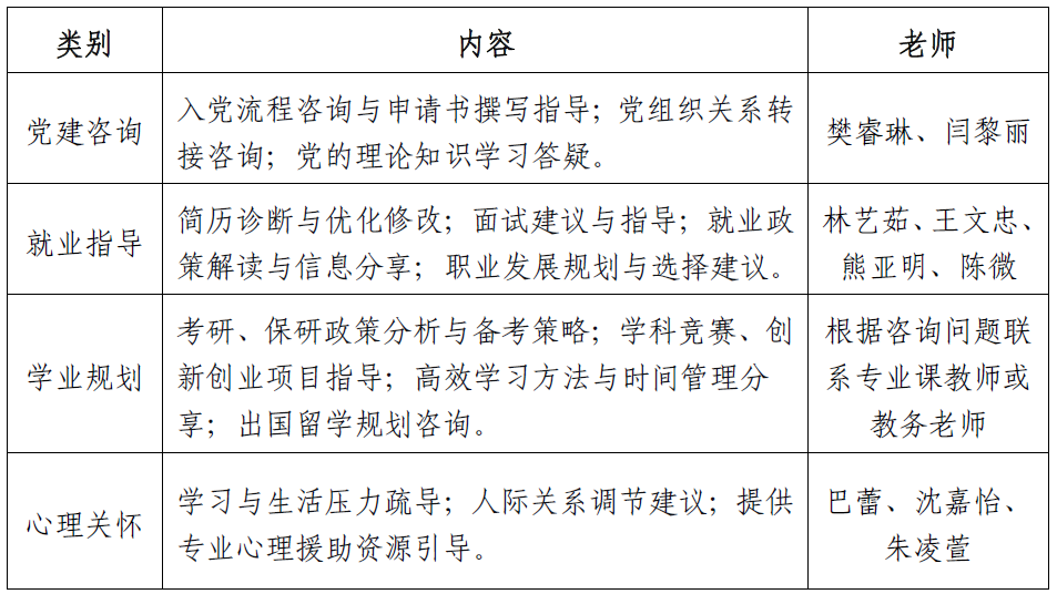 注:根据学生咨询情况及老师时间统筹安排,如有疑问或有特别指定老师,请联系闫老师(办公电话62288376)。