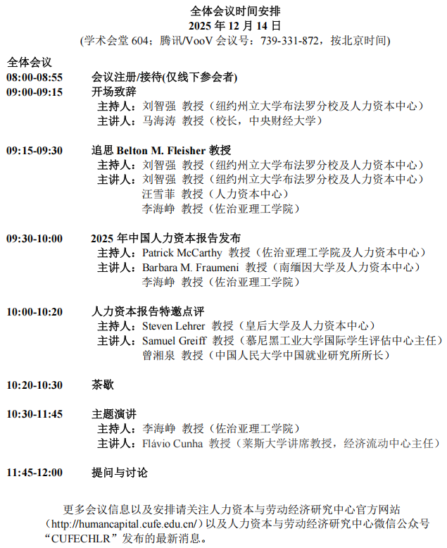 更多会议信息以及安排请关注创新发展学院人力资本与劳动经济研究中心官方网站(http://humancapital.cufe.edu.cn/)以及人力资本与劳动经济研究中心微信公众号“CUFECHLR”发布的最新消息。