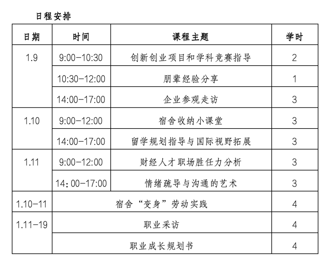 本次劳动与实践周将依托学院就业指导工作室,围绕就业实训、劳育实践、综合素养提升等三个方面开展。就业实训将围绕行业认知、兴趣探索、能力储备三个方面,通过实务讲座、企业参访、职业访谈等方式,帮助同学了解新经济形势下就业市场的人才需求,了解“职场人”的工作生态,储备面对职场的必备技能。劳育实践将重点围绕“共创温馨雅舍”,开展“收纳”讲堂、宿舍“变身”实践等活动,帮助同学规划设计宿舍空间利用,打造干净整洁宿舍环境。综合素养提升将针对同学们关心的学术赛事和留学规划等,举行系列指导讲座,帮助同学早准备、早规划,提升自身竞争力。本次劳动实践周整体总计30学时。
