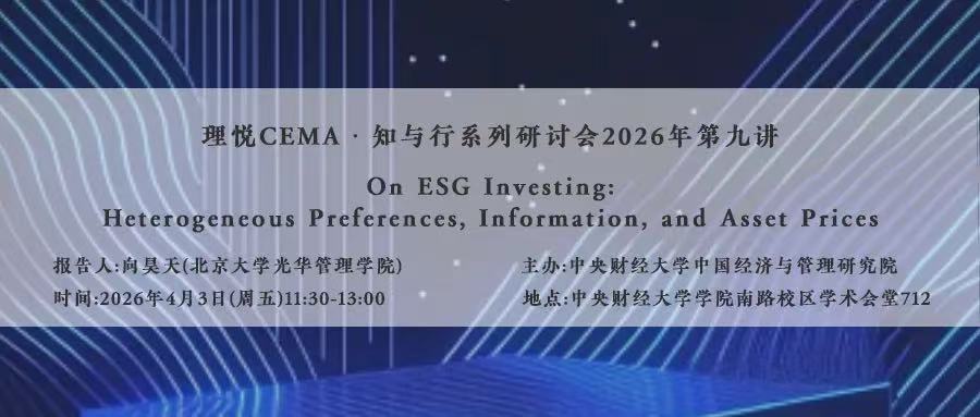 【学术讲座】理悦CEMA•知与行系列研讨会2026年第九讲——论 ESG 投资:异质性偏好、信息与资产定价 简介理悦CEMA•知与行系列研讨会2026年第九讲将于4月3日(周五)中午11:30-13:00在学术会堂712会议室举行,由北京大学光华管理学院金融学系副教授、博士生导师,北京大学国家高新技术产业开发区发展战略研究院副院长向昊天老师报告金融理论论文“On ESG Investing: Heterogeneous Preferences, Information, and Asset Prices”(论 ESG 投资:异质性偏好、信息与资产定价)欢迎广大师生(尤其是对科研有兴趣和追求的本科生、...