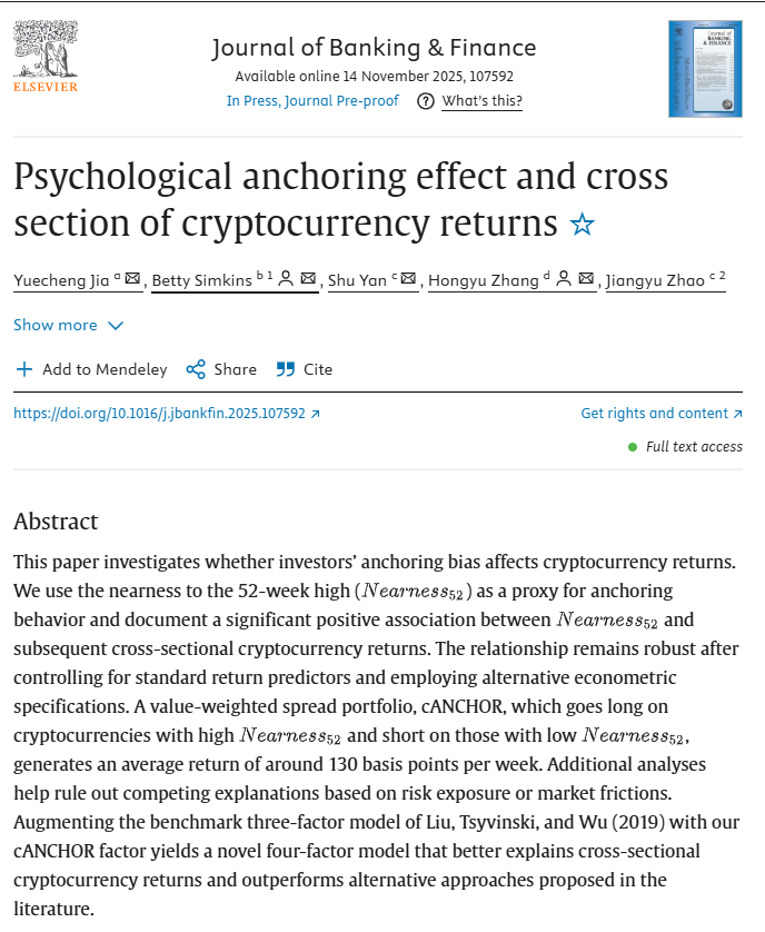 近日,我院贾越珵副教授的论文“Psychological anchoring effect and cross section of cryptocurrency returns”在金融领域的国际权威期刊Journal of Banking and Finance(ABS 3,中财AA类)正式发表。该论文的合作者为中央财经大学商学院张宏宇教授、Oklahoma State University的Betty Simkins教授、阎澍教授、以及该校博士生赵姜宇同学。其中,赵姜宇同学是我院2023届硕士毕业生,在读期间导师为贾越珵副教授。