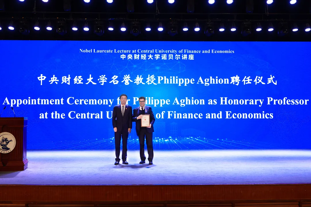 11月14日,2025年诺贝尔经济学奖得主菲利普·阿吉翁(Philippe Aghion)受聘为中央财经大学名誉教授并作专题讲座。讲座在中央财经大学学院南路校区学术会堂206举行,校长马海涛教授、副校长陈斌开教授、1998级货币银行专业校友李一南博士,以及校内各单位、部门负责人,校友代表、媒体、师生等现场聆听讲座。讲座由副校长,创新发展学院党委书记、院长李涛主持。