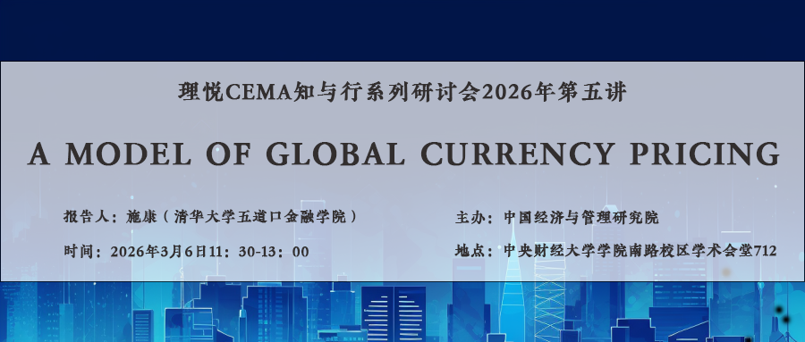 理悦CEMA•知与行系列研讨会2026年第五讲将于3月6日(周五)中午11:30-13:00在学术会堂712会议室举行,由清华大学五道口金融学院讲席教授、SSCI期刊China Economic Review联席主编、《经济学报》副主编施康教授报告国际/开放宏观经济学论文:“A Model of Global Currency Pricing”(一个全球货币定价模型)。欢迎广大师生(尤其是对科研有兴趣和追求的本科生、硕士生和博士生)参加。