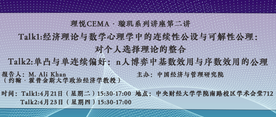理悦CEMA•璇玑系列讲座第二讲将于2026年4月21日(周二)及2026年4月23日(星期四)下午15:30-17:00在学术会堂712会议室举行,由约翰·霍普金斯大学的Abram Hutzler政治经济学教授M. Ali Khan报告以下内容:
