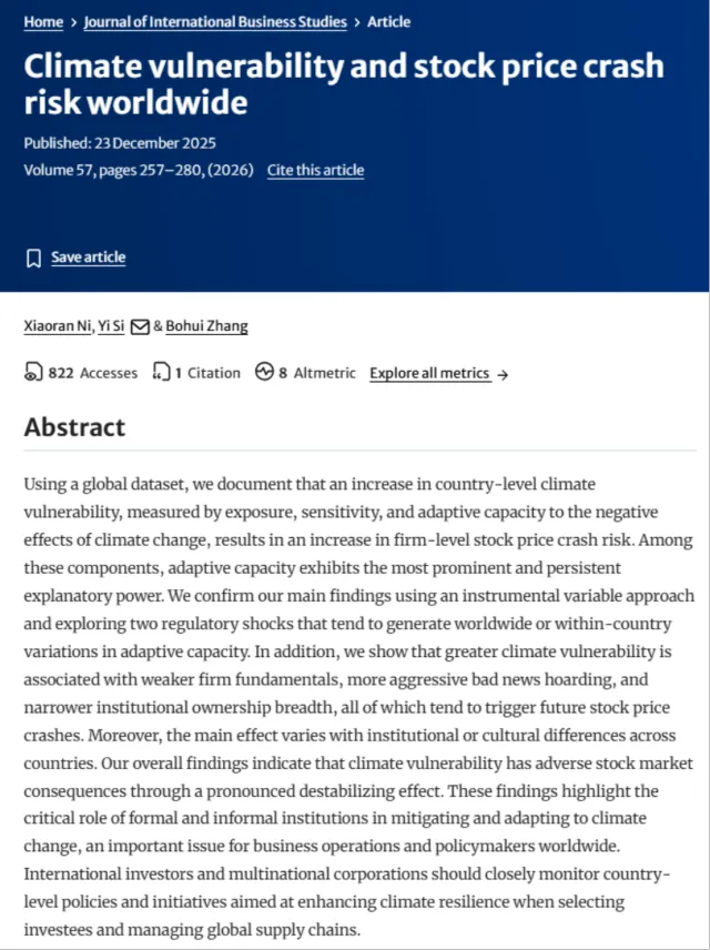 近日,我院倪骁然教授的论文“ Climate vulnerability and stock price crash risk worldwide ”在管理学国际顶级期刊Journal of International Business Studies(UTD24期刊,中财AAA类)发表,于2026年4月在第57卷第2期正式刊出。该论文的合作者为西安交通大学司毅教授和香港中文大学(深圳)张博辉教授。