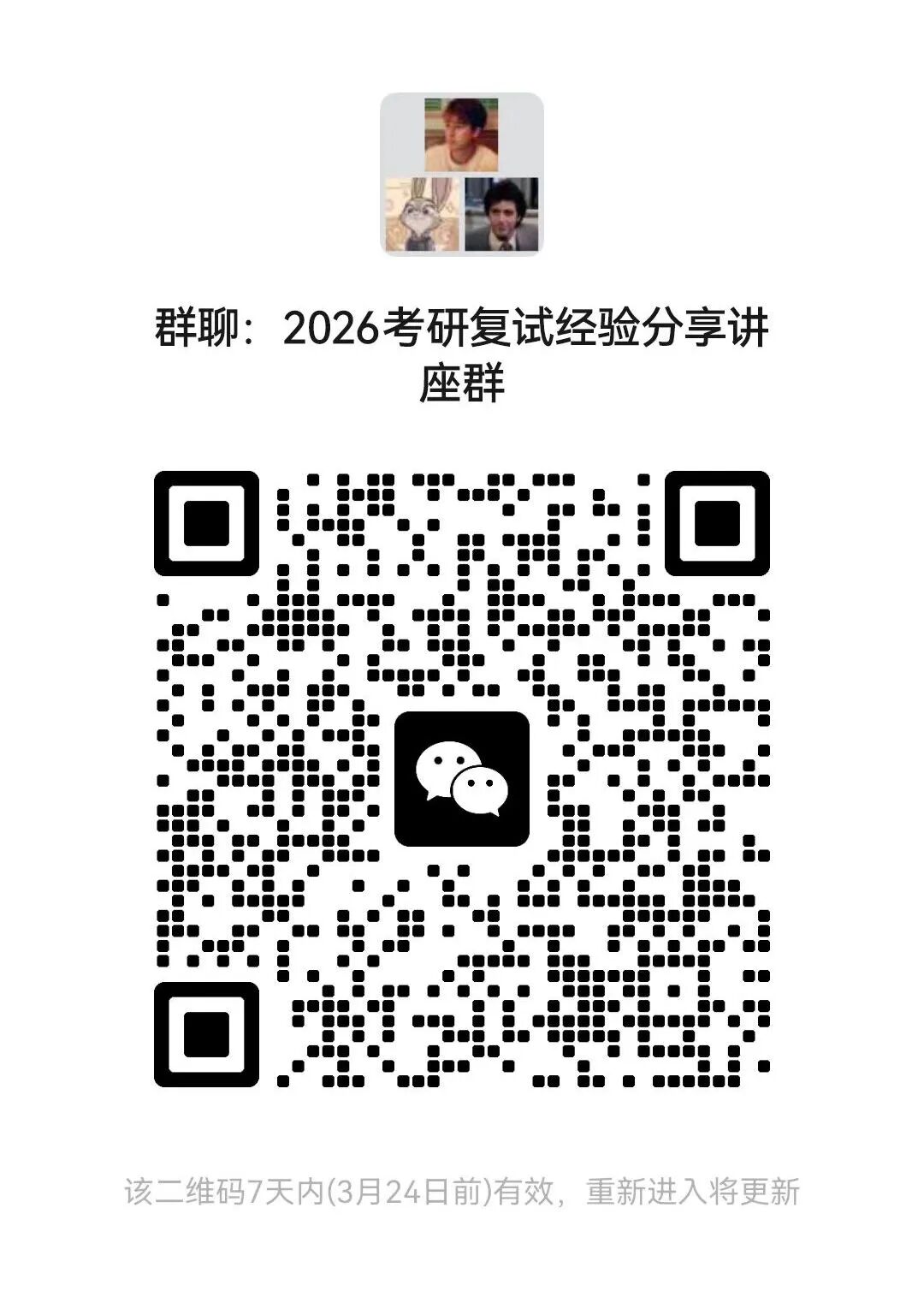 欢迎各位同学扫码加入2026年考研复试经验分享讲座群了解更多讲座相关信息。若群聊二维码过期或人数已满,请扫描右侧二维码添加工作人员微信进群。