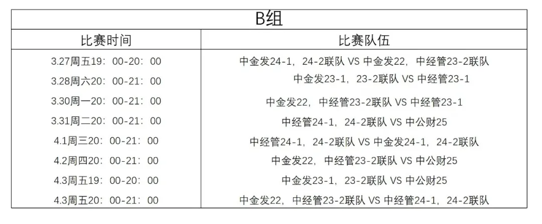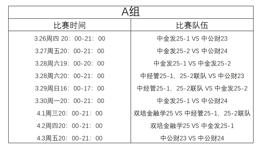 本次比赛由小组赛和淘汰赛两部分组成。12支队伍按照抽签结果分为A、B两组进行小组循环赛,决出小组前二名出线进行淘汰赛,最终决出创新发展学院第三届班级排球赛冠亚季军。清明假期前小组赛赛程如下: