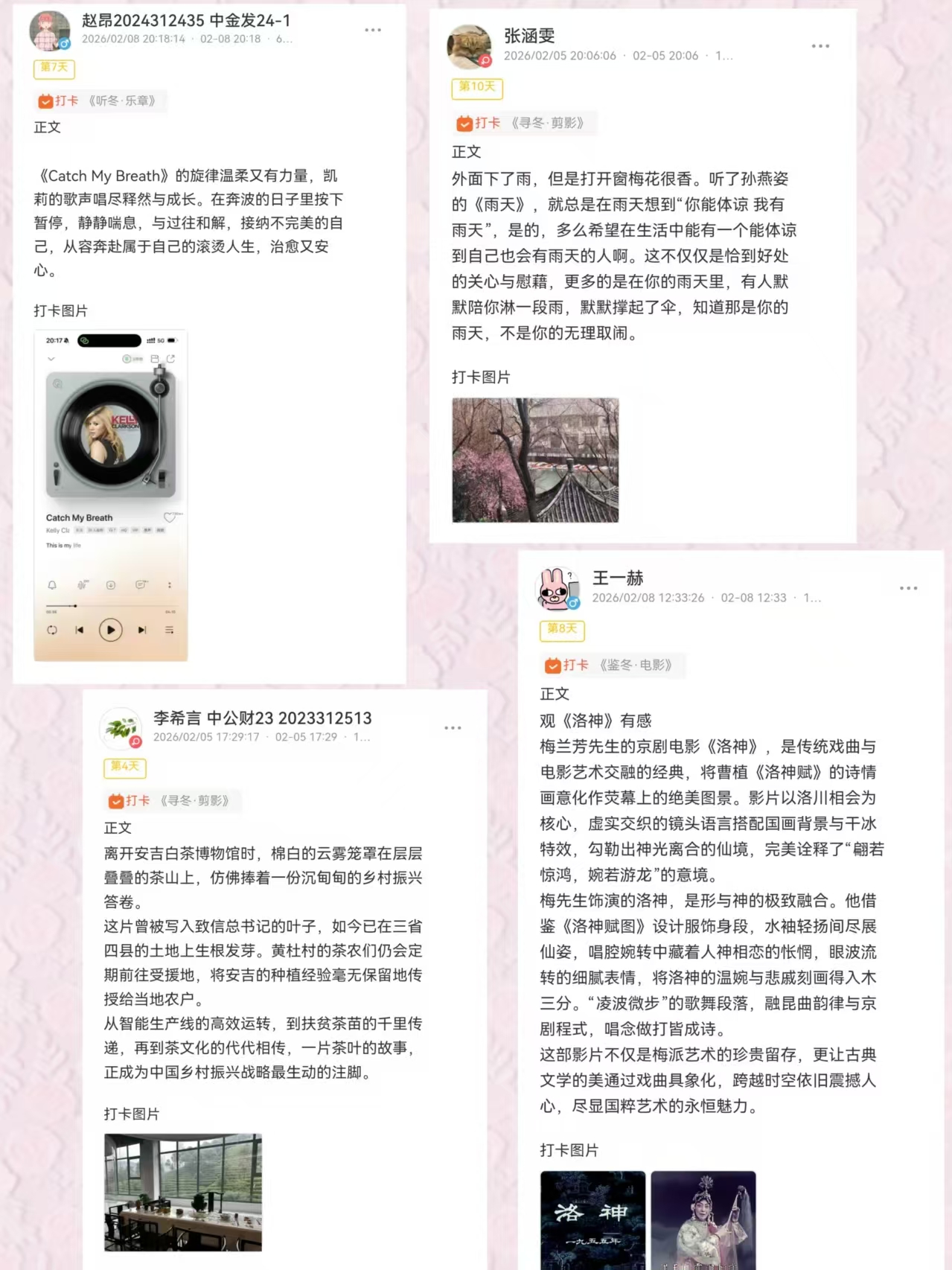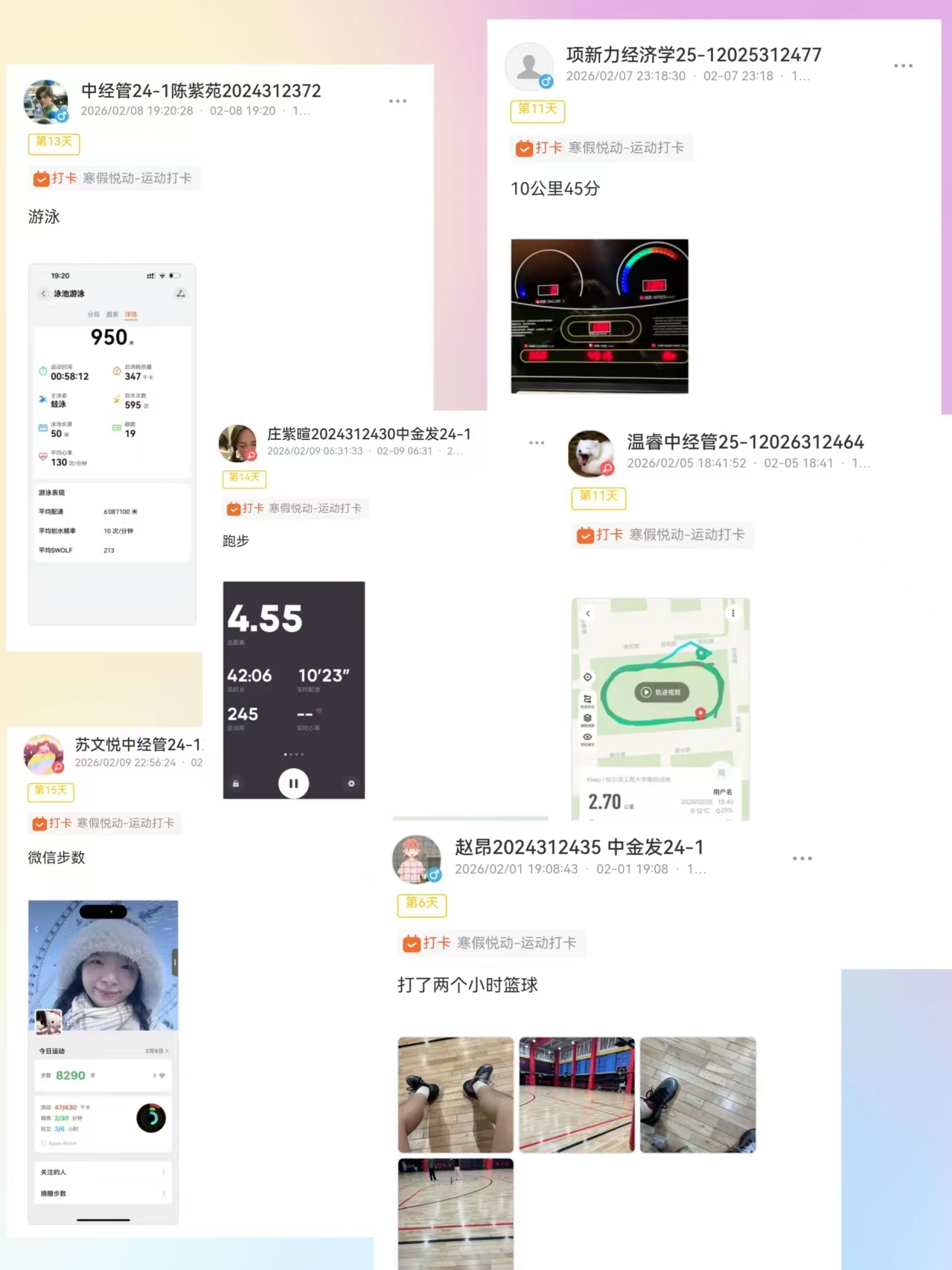 “从一开始刻意遵守要求打卡,到后来慢慢成为一种生活习惯,这段坚持的过程,不仅让我顺利完成了活动任务,更让我的寒假生活变得充实而有意义。也正是这份对美好的用心记录与感知,让这个忙碌的冬天,多了一份别样的温暖。”
