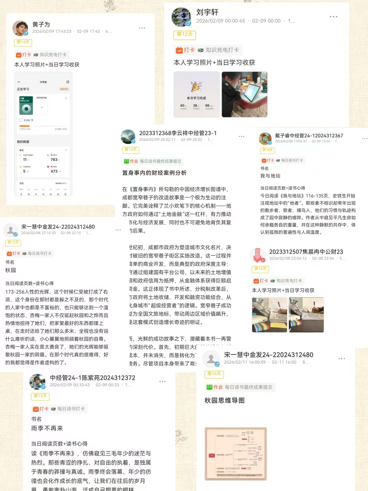 在“创发求索”主题活动中,同学们打卡过程中,大家纷纷晒出专属学习瞬间,附上当日学习收获与感悟,从《置身事内》中剖析中国经济发展的底层逻辑,在《我与地坛》里品读史铁生笔下的生命哲思,从《秋园》的时代叙事中体会人性的光辉与善良,在《雨季不再来》中共鸣三毛的青春迷茫与自由执着。专业学习与经典阅读相辅相成,同学们不仅完成了既定的学习任务,更在持续的积累与思考中拓宽认知边界,让假期成为专业深耕与视野拓展的黄金期,真正实现了“每日有收获,日日有进步”。