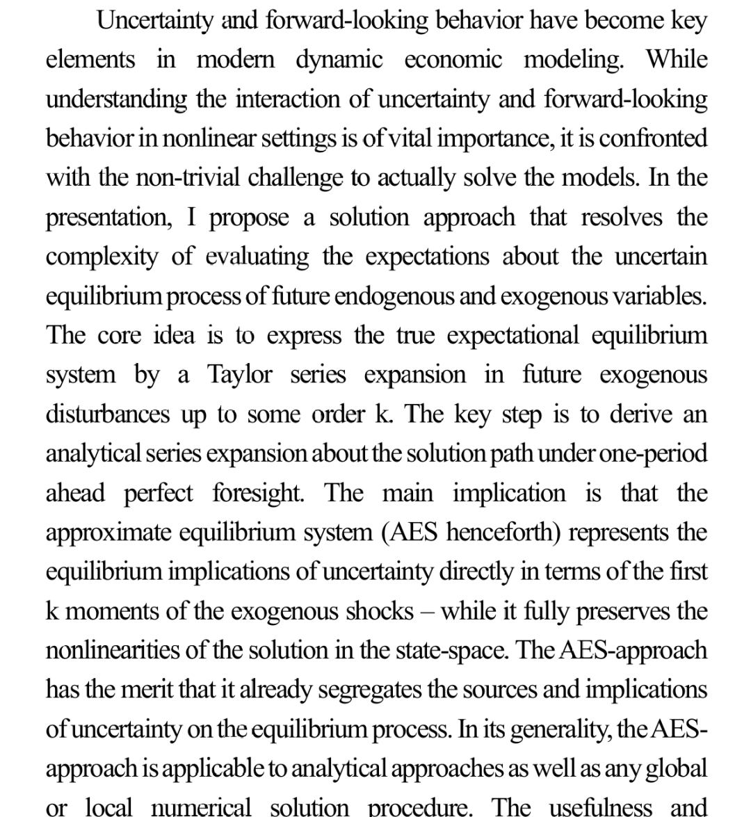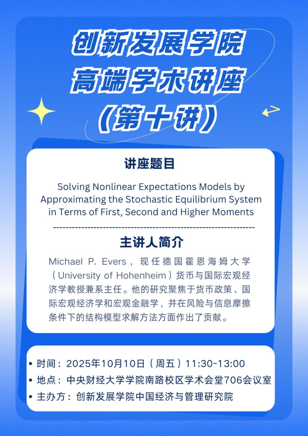 创新发展学院高端学术讲座(第十期),理悦CEMA•知与行系列研讨会2025年下学期第2讲将于10月10日(周五)11:30-13:00在学术会堂706会议室举行,由德国霍恩海姆大学(University of Hohenheim)货币与国际宏观经济学教授兼系主任Michael P. Evers报告“Solving Nonlinear Expectations Models by Approximating the Stochastic Equilibrium System in Terms of First, Second and Higher Moments”,欢迎感兴趣的师生(尤其是对科研有兴趣的本科生、硕士生和博士生)参加。