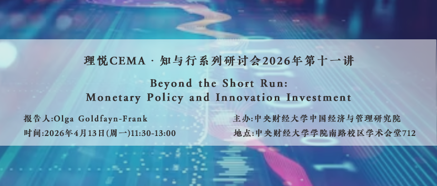 【学术讲座】超越短期:货币政策与创新投资 简介理悦CEMA•知与行系列研讨会2026年第十一讲将于4月13日(周一)中午11:30-13:00在学术会堂712会议室举行,由Olga Goldfayn-Frank主讲主题为“Beyond the Short Run: Monetary Policy and Innovation Investment”(超越短期:货币政策与创新投资)的讲座。欢迎广大师生(尤其是对科研有兴趣和追求的本科生、硕士生和博士生)参加。讲座对所有人免费开放,不需要提前预约。讲座主题Beyond the Short Run: Monetary Policy ...