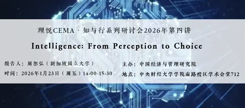 【学术讲座】理悦CEMA•知与行系列研讨会2026年第四讲——智慧:从感知到抉择 简介理悦CEMA•知与行系列研讨会2026年第四讲将于1月23日(周五)下午14:00-15:30在学术会堂712会议室举行,由西南财经大学智慧经济科学研究中心主任,新加坡国立大学经济系讲席教授周恕弘教授报告人脑是如何做决策的微观经济学深层的研究:“Intelligence: From Perception to Choice”(智慧:从感知到抉择)。欢迎广大师生(尤其是对科研有兴趣和追求的本科生、硕士生和博士生)参加,讲座结束后周教授愿意给个discussion s...