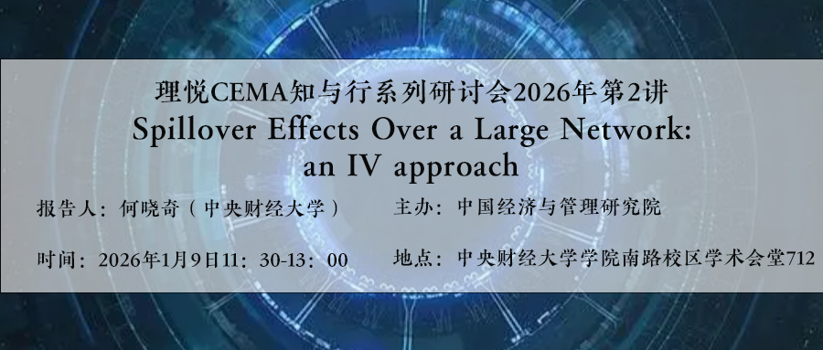 理悦CEMA·知与行系列研讨会2026年第二讲——大规模网络下的溢出效应:一种工具变量方法 简介理悦CEMA-知与行系列研讨会2026年第二讲将于1月9日(周五)中午11:30-13:00在学术会堂712会议室举行,由中央财经大学何晓奇副教授报告理论计量经济学论文:“Spillover Effects Over a Large Network: an IV approach”(大规模网络下的溢出效应:一种工具变量方法)。欢迎广大师生(尤其是对科研有兴趣和追求的本科生、硕士生和博士生)参加。题目Spillover Effects Over a Large Network: an IV approach报告人何晓奇...